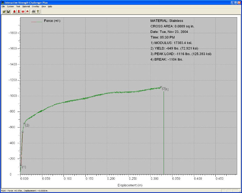 An optional materials evaluation kit is available complete with various metal specimens, test adapter and Windows tensile software. Easily evaluate the elastic properties of aluminum, brass, copper and steel by smoothly stretching them apart and plot the results for comparison. The software analyzes the test results and graphically identifies important properties such as yield and break points and calculates the modulus of elasticity. A materials report can also be printed to document the test the same way the industry records test results today.